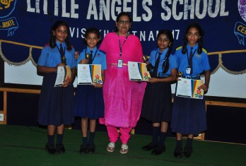 The programme on the first day by and large covered prizes in academics and arts - Olympiads, Asset, Inter-house competitions, Music, Art, Dance etc. More than 250 prizes were given away on day 1. Speaking on the occasion, the Founder & Chairman Sri. M.Venu Mohan emphasised on the paramount need to inculcate the quality of punctuality among students at a young age. He inspired the children to have cutting edge over others to realize their true potentiality and get ready to face the world. He also said that Little Angels is very unique in creating an ambience for sports and games as an integral part of education. Recalling the contemporary sports celebrities like M.S.Dhoni and P.V.Sindhu, he exhorted the students to take up sports enthusiastically. He proved his magnanimity by sponsoring two cricket kits for the under privileged children of “Generation Yuva” and SOS village.