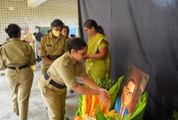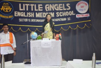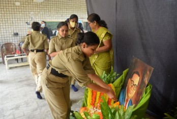 The Virasat Club observed Constitution Day in the school on 26th November. In this connection, a special assembly was conducted through PA System in which Principal Smt. P. Visalakshi rendered the preamble. A special article in the form of a conversation was read by the students of class 9. Floral tributes were paid to the portrait of Dr. B. R. Ambedkar by Smt. P. Visalakshi, HeadMistress Smt. Arundhati, teachers and NCC cadets.