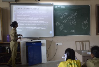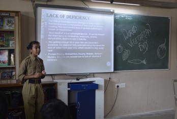 They spoke about the importance of different vegetables and fruits in their respective Science classes. Children of classes 8, 9 and 10 gave a PowerPoint presentations about various categories of the vegetarian food, its sources, its importance and its advantages over eating non-vegetarian food.