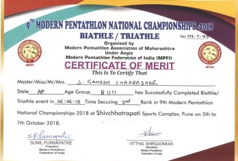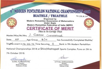 Master Jakka Ganesh Chakradhar of 6-F added another feather in the cap of Little Angels by achieving a Gold Medal in Biathle Event and a Silver Medal in Triathle event in 9th Modern Pentathlon National Championships-2018 held at Pune from 5th to 7th October, 2018.