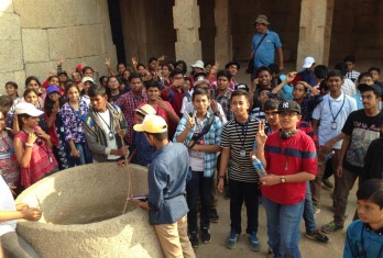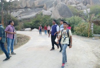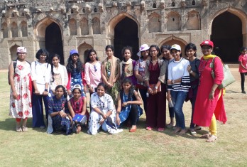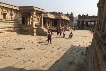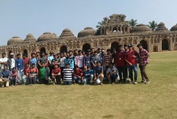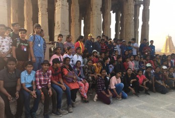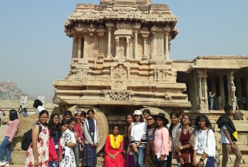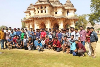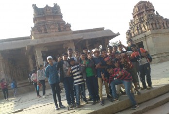 Students were mesmerized to see the scenic beauty of Hampi, which welcomes you to its world of huge boulders and lush green trees alongside the river silently flowing making its course. The enthusiasm of students boosted after seeing the ruined temple complexes of the VijayanagaraEmpire on the banks of river Tungabhadra. The team enjoyed watching the beautiful architecture of Virupaksha temple, Carved Stone Chariot, Vitthala temple, Krishna temple, LotusMahal, Elephant’s Stable, Royal Enclosure, magnificent monolithic idol ofUgraNarasimha, BadaviLinga and Mustard Ganesha. The Musical Pillars in RangaMandapa at Vitthala temple amazed all as it produced musical notes when struck. Students noted down the significance of every place as told by the Guide.