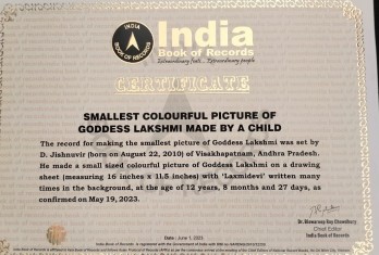 We applaud and congratulate Jishnuvir, his parents, and the art teachers for supporting and fostering his passion for painting over the years. His name is entered in the “INDIA BOOK OF RECORDS 2023” for drawing a colourful picture of Goddess Lakshmi on a drawing sheet (measuring 16 inches x 11.5 inches) with ‘Laxmidevi’ written many times in the background. It took him continuous 5 hours of sheer hard work to complete this painting. He has accomplished this record at the age of 12 years 8 months and 27 days as confirmed on 19th May, 2023.