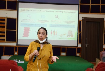 The session began with a welcome note and introduction of the eminent resource person Mrs. Gayatri Khanna who is a renowned name in the field of education for her expertise and experience of over 30 years in English and also the incharge for updating materials for the grades 9 and 10 CBSE & NCERT. She spoke on the new education policy and the sea of changes that will happen across all levels of education in India. It is based on the pillars of ‘access equity, quality, affordability and accountability’. She shed light on the creation of a new structure with 5 + 3 + 3 + 4 and discussed about the redesign of report cards which include self-assessment, peer assessment and teacher assessment. Besides this, she also discussed on SAFAL, PARAKH, PISA, STEM, STEAM AIL. She also discussed about the introduction of integration of experiential learning, competency-based education, art and sports integrated education introducing 10 bagless days in an academic year. There was a question-and-answer session in which teachers expressed their concerns and raised queries which were addressed by the resource person.